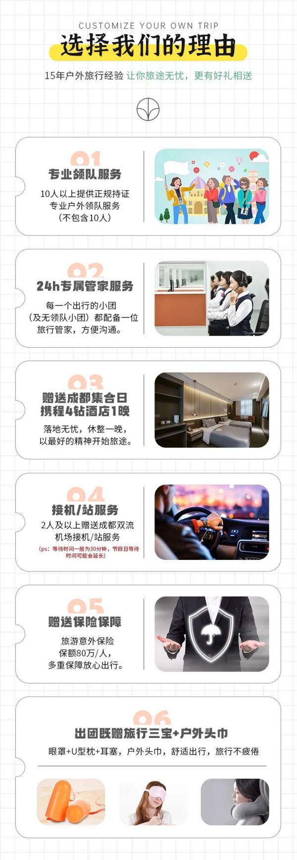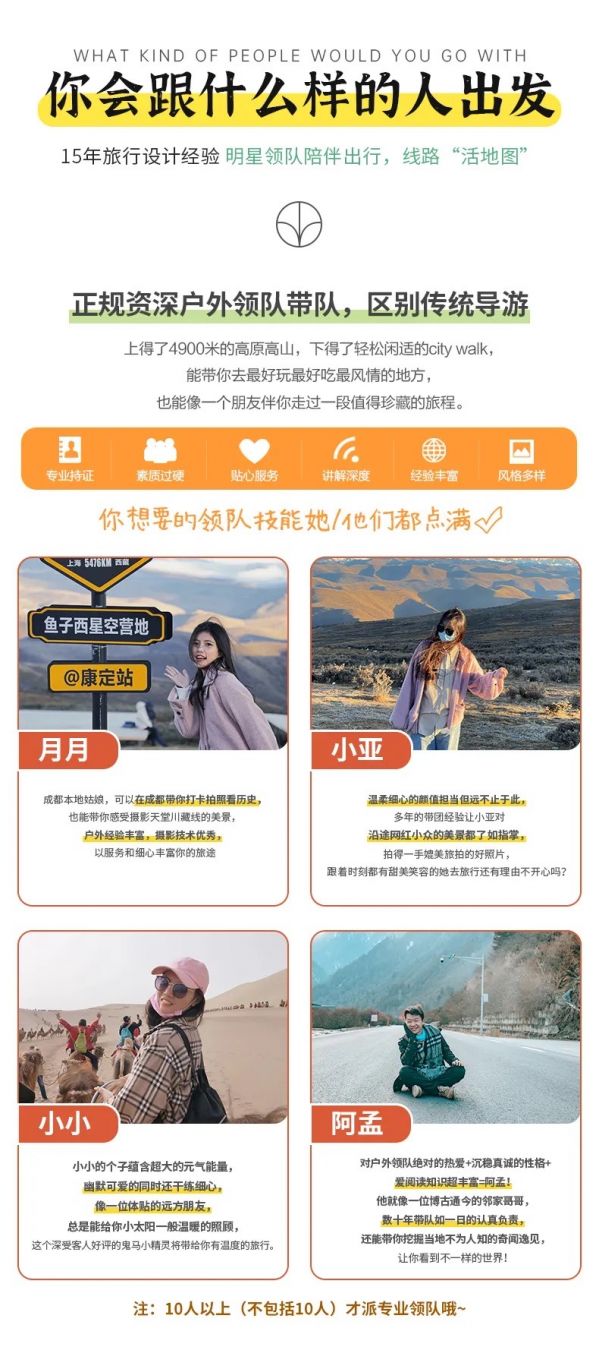 私人訂制:我們業(yè)務范圍囊括了全國各大城市,川西、西北、新疆,在路上永遠有我們的身影。我們將為每一個有定制需求的你策劃出獨屬于自己的完美旅行。