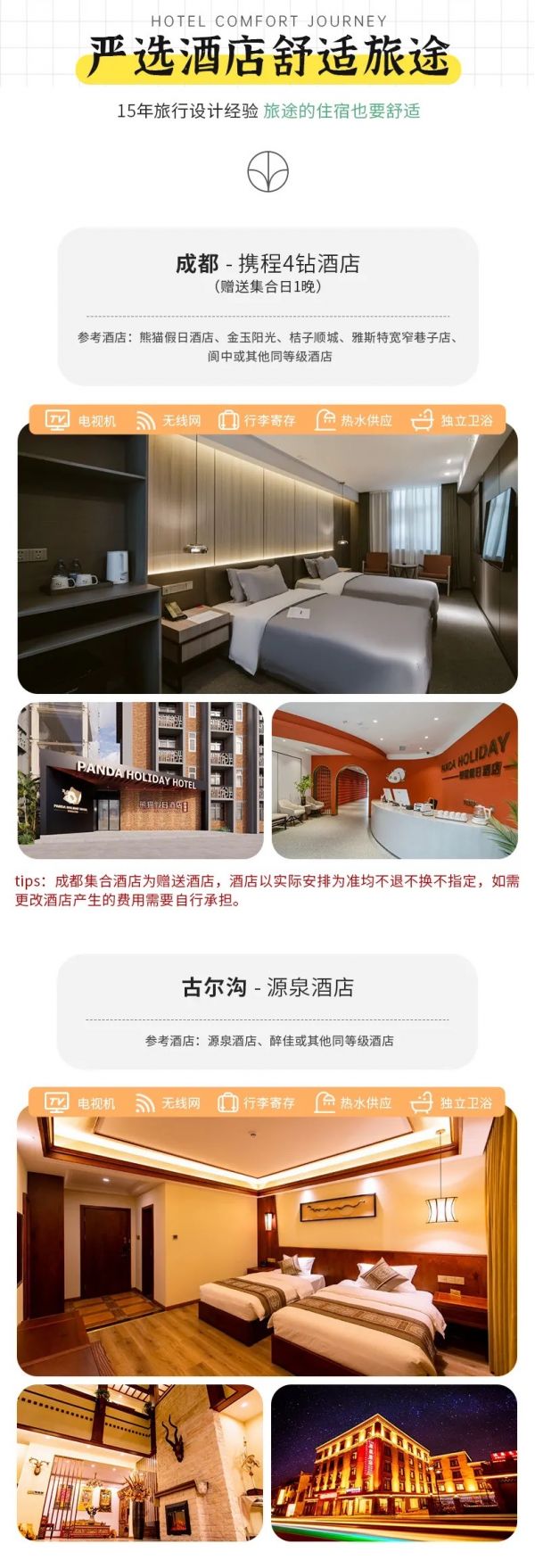 住宿:含全程5晚舒適酒店。(tips:成都集合酒店為贈送酒店,酒店以實際安排為準均不換不退不指定,如要更改酒店產(chǎn)生的費用需要自行承擔。)