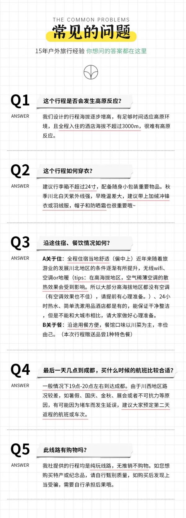 (1)以上行程時間安排可能會因天氣、路況等原因做相應調(diào)整,正常情況下完團回到成都時間為晚上19:00至20:00左右,如果必須當日離開,請定22:00以后的回程大交通,以免耽誤行程,敬請諒解;