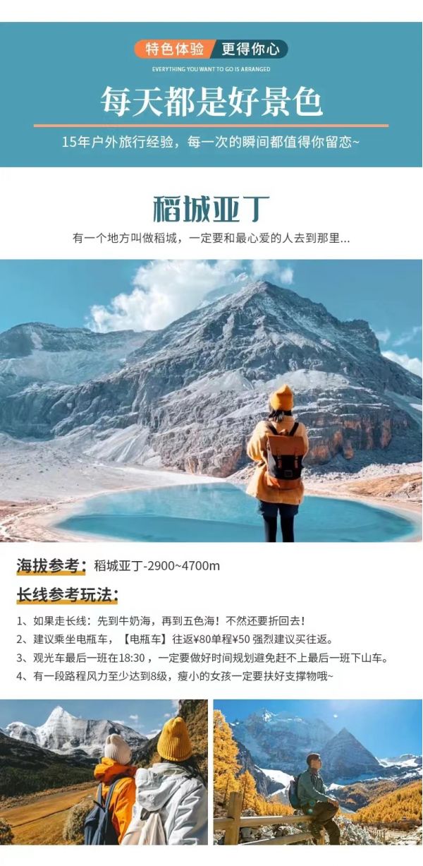 溫馨提示:(1)冬季11月-次年3月如因魚子西/格底拉姆封山無法前往,則將魚子西/格底拉姆景點換為八郎生都。