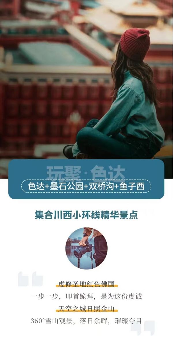 私人訂制:我們業(yè)務(wù)范圍囊括了全國各大城市,川西、西北、西藏、新疆,在路上永遠(yuǎn)有我們的身影。我們將為每一個(gè)有定制需求的你策劃出獨(dú)屬于自己的完美旅行。