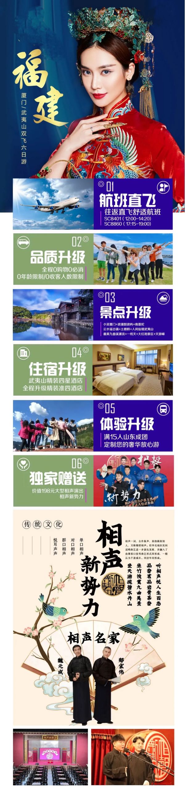 到達后導游接站游【大紅袍景區(qū)】四顆珍貴的大紅袍茶樹在九龍窠下,人稱“茶中之王”。游全國最窄的【一線天】,伏羲洞、靈巖洞、風洞三洞相映成趣、神仙樓閣等奇妙景 白天登天游,晚上聽相聲,----獨家贈送價值198元【大型相聲演出】---相聲新勢力,來聽聽武夷山茶文化和相聲文化的完美結(jié)合吧,嗑瓜子,品香茗,聽相聲,絕這才是旅行的正確打開方式!
