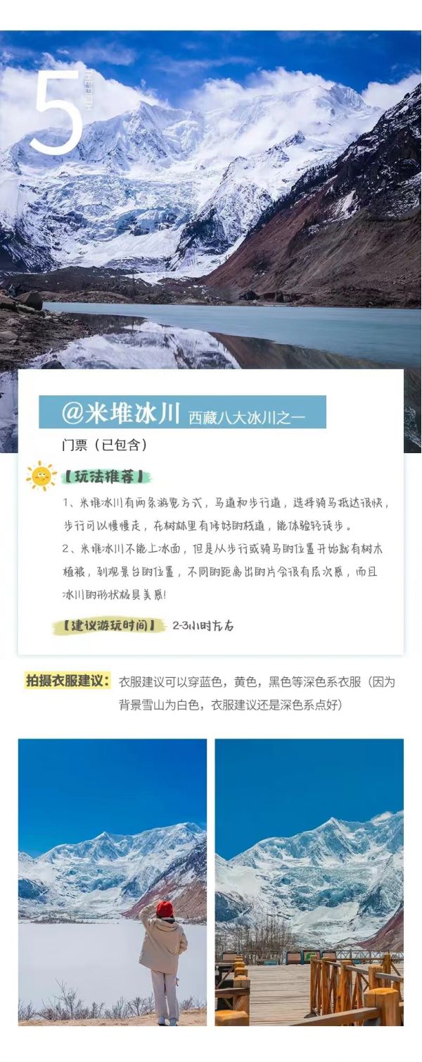 然后我們來到位于然烏湖北面的著名的【米堆冰川】,冬季更是觀看藍(lán)冰的最佳時機(jī),米堆冰川位于藏東南的念青唐古拉山與伯舒拉嶺的接合部,這里是我國最大季風(fēng)海洋性冰川的分布區(qū)。該冰川常年雪光閃耀,景色神奇迷人。山上冰川融化出涓涓細(xì)流在千百年的努力下漸漸割開了冷硬的凍土,孕育出了川藏線的明星然烏湖,也成了河谷地帶人們安居樂業(yè)的希望所在。