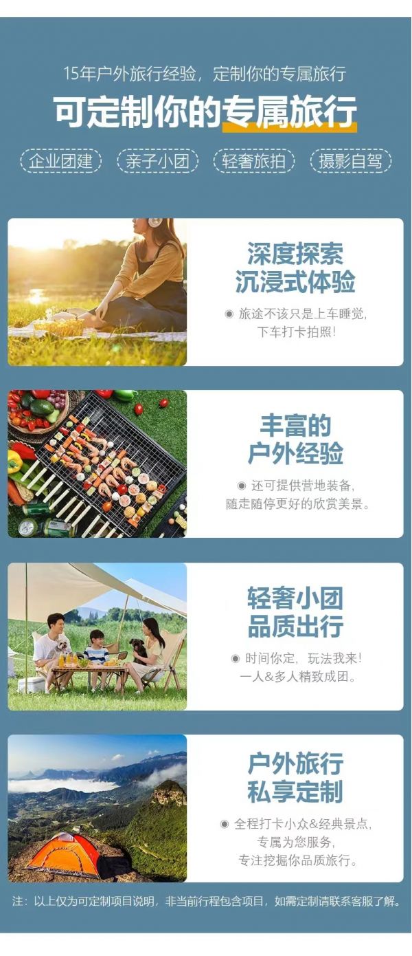 私人訂制:我們業(yè)務(wù)范圍囊括了全國(guó)各大城市,川西、西北、新疆、西藏,在路上永遠(yuǎn)有我們的身影。我們將為每一個(gè)有定制需求的你策劃出獨(dú)屬于自己的完美旅行。