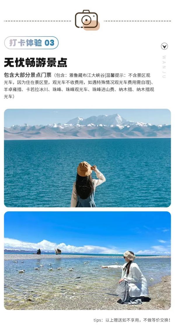 門(mén)票:包含雅魯藏布江大峽谷{溫馨提示:不含景區(qū)觀光車,因?yàn)樽≡诰皡^(qū)里,觀光車不收費(fèi)用,如遇特殊情況觀光車費(fèi)用需自理}、羊卓雍措、卡若拉冰川、珠峰大本營(yíng)門(mén)票、珠峰觀光車、珠峰進(jìn)山費(fèi)、納木措、納木措觀光車。