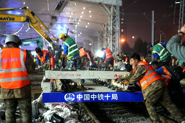 11月16日凌晨,在濟(jì)南火車(chē)站,由中鐵十局承建的濟(jì)鄭高鐵山東段濟(jì)南站站改工程順利完成,標(biāo)志著濟(jì)鄭高鐵正式引入濟(jì)南站。圖為在濟(jì)南火車(chē)站,中鐵十局的工作人員正在對(duì)濟(jì)鄭高鐵引入濟(jì)南站進(jìn)行站改作業(yè)。
