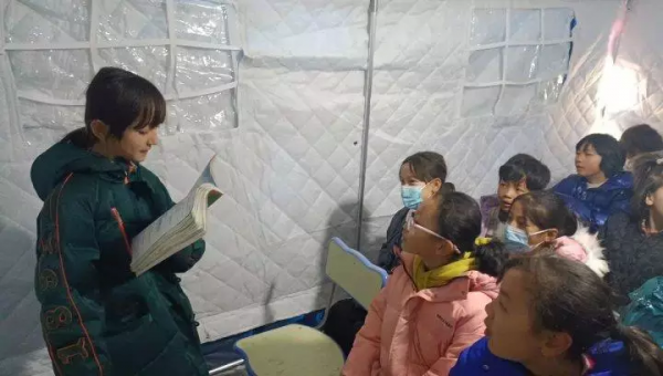 22號上午在位于甘肅省積石山縣石塬鎮(zhèn)肖紅坪村的一個臨時安置點,總臺記者在采訪時聽到了朗朗的讀書聲,這里搭建起了甘肅震區(qū)首個帳篷學校。