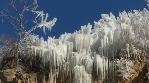 這是他第一次欣賞濰坊冬日的山水風(fēng)景。雪花被樹(shù)枝上的水珠凍結(jié),森林樹(shù)木變成一片白色,平日里流水潺潺的瀑布凝結(jié)成晶瑩剔透的冰瀑群,這些別具特色的冰雪奇觀,十分震撼。