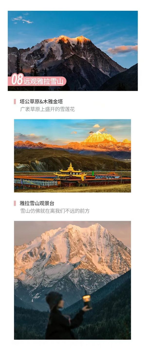 甲居藏寨 - 雅拉雪山觀景臺(tái) - 墨石公園 - 塔公草原 - 瑪尼河谷 - 雅江