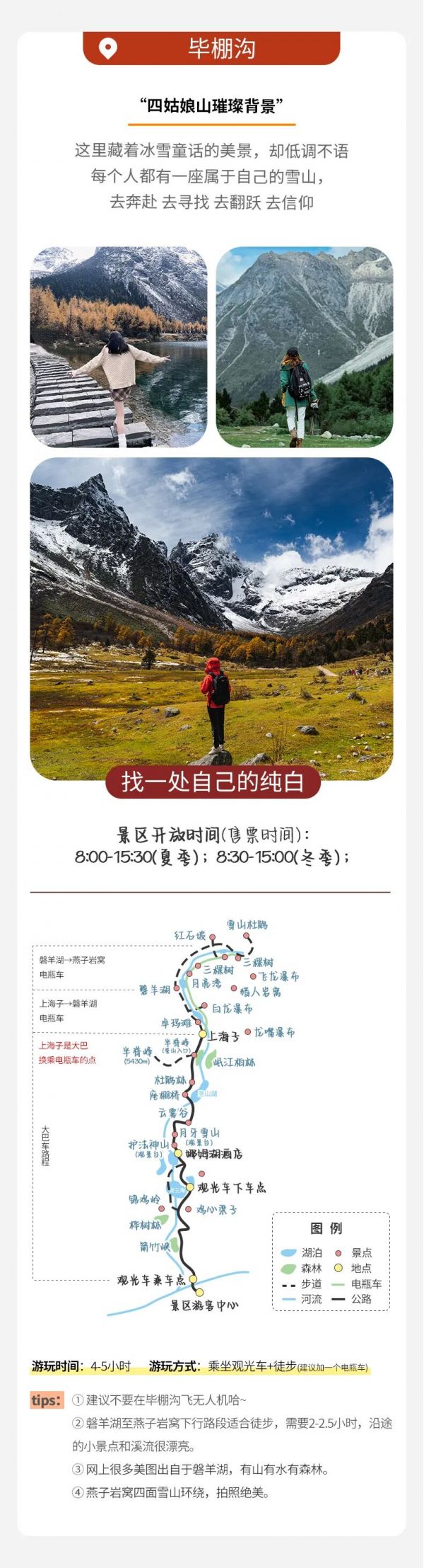 ? 美麗的山水世界【畢棚溝景區(qū)】(游覽時(shí)間3-4小時(shí))換乘景區(qū)觀光車,觀賞古樸的原始風(fēng)光,海龍王潭、女皇峰、娜姆湖、神女十二蜂、盤(pán)羊湖,美景讓您流連忘返, 這與大自然最親密的接觸, 留在心里,回味一生!冬季的畢棚溝,銀裝素裹,美不勝收,滑 雪、堆雪人,打雪仗,各種雪上娛樂(lè)項(xiàng)目其樂(lè)無(wú)窮。仿佛穿行如夢(mèng)如幻的冰雪童話世界,畫(huà)下你的身影,將您的祝福永遠(yuǎn)留在這里!穿梭于原始森林,眺綿延崎雪山雄峰、望飛瀉而下 的瀑布、看星羅棋布的海子、覓時(shí)有出沒(méi)的山珍野獸,夢(mèng)幻般的世界讓你領(lǐng)略別樣的異族風(fēng)情。