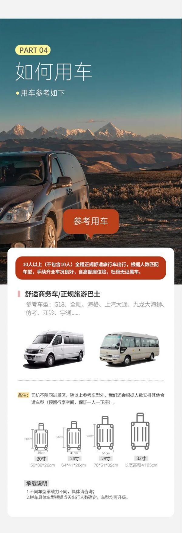 用車:車型根據(jù)人數(shù)決定,保證每人一正座;包含司機(jī)一名、油費(fèi)、過(guò)路費(fèi)、停車費(fèi),包含從出發(fā)地到景點(diǎn)及酒店費(fèi)用,不包含晚間自由活動(dòng)交通;