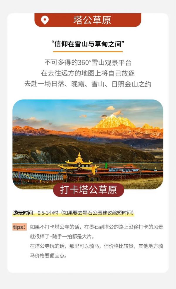 ? 【塔公草原】這是一處令人驚喜的取景地,塔公沿路野花盡享盛放,綠茵茵的草地上偶爾有白底藍(lán)色圖案的賬蓬隨意地支著,可能還會(huì)有牦牛、馬或羊等悠閑吃草的身影闖進(jìn)視野里,你的心情也會(huì)變得明朗而隨意起來(lái),游覽時(shí)間約1H。