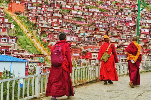 ? 震撼的佛國(guó)畫(huà)卷逐漸展開(kāi)--入目處盡是朱紅的佛色,裹著紅袍的僧人在其間穿行,空氣里彌漫著佛香。在金紅相間的佛學(xué)院漫步,學(xué)著僧人面目虔誠(chéng)地轉(zhuǎn)經(jīng)、朝拜,在觸動(dòng)轉(zhuǎn)經(jīng)筒的旋轉(zhuǎn)中,感受“信仰”的具象化。
