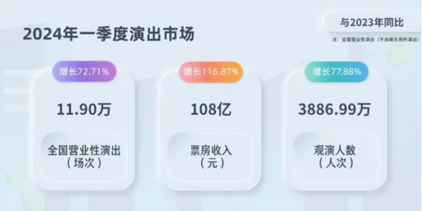 “復(fù)蘇即狂熱”。中國演出行業(yè)協(xié)會發(fā)布的數(shù)據(jù)顯示,2024年一季度,全國營業(yè)性演出(不含娛樂場所演出)場次11.90萬場,相當(dāng)于全國范圍內(nèi)日均超過1300場。