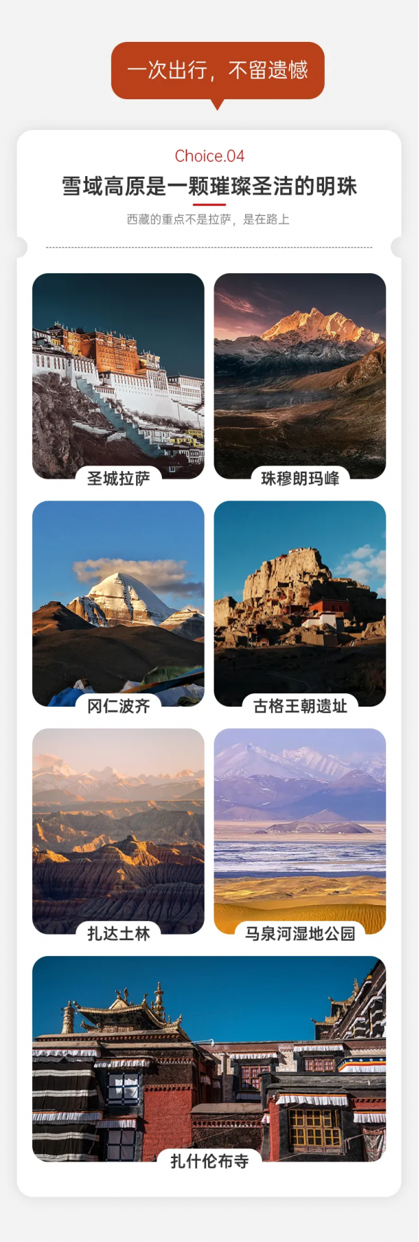 在不減少主要景點的前提下,組織方有權(quán)利根據(jù)天氣、航班、交通、季節(jié)、旺季人潮等因素,調(diào)整游覽景點的先后順序。藏區(qū)春夏季多雨,經(jīng)常造成泥石流及塌方,由于以上原因及其他人力不抗拒原因而造成團隊不能按照行程前往目的地以外地區(qū)旅游,接待方不承擔(dān)任何賠償責(zé)任,我們將會根據(jù)實際情況另外增加景點用以彌補,費用多退少補。