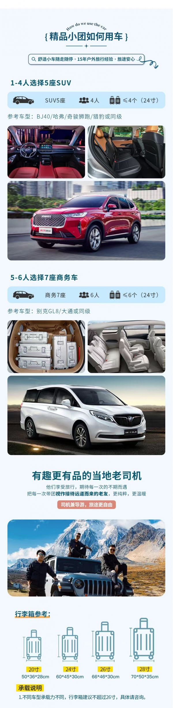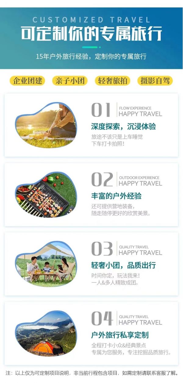 私人訂制:我們業(yè)務(wù)范圍囊括了全國(guó)各大城市,川西、西北、西藏、新疆,在路上永遠(yuǎn)有我們的身影。我們將為每一個(gè)有定制需求的你策劃出獨(dú)屬于自己的完美旅行。