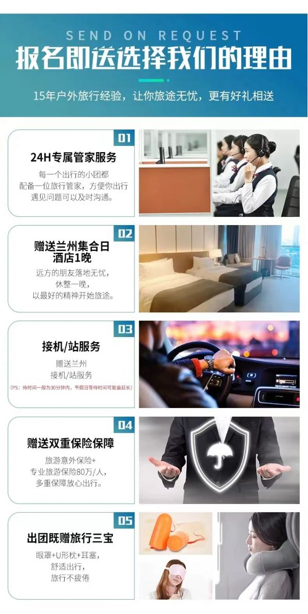 接站服務(wù):2人及以上免費(fèi)提供蘭州市區(qū)拼車接火車服務(wù),接火車的工作人員會(huì)在您出發(fā)日期前一天21:30之前向您推送消息并與您聯(lián)系,如果超過(guò)時(shí)間沒(méi)有接到任何通知,請(qǐng)及時(shí)與領(lǐng)隊(duì)或報(bào)名處聯(lián)系。(節(jié)假日用車人數(shù)較多情況下客人等待時(shí)間可能會(huì)延長(zhǎng);我方會(huì)安排臨近航班拼車接站,如遇其他客人航班火車延誤晚點(diǎn)情況,等待時(shí)間可能會(huì)延長(zhǎng),敬請(qǐng)諒解)