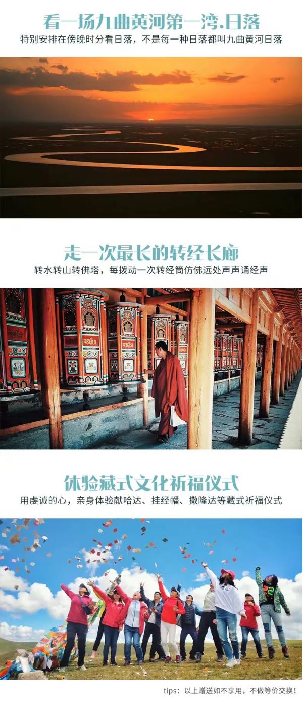 繼續(xù)往前【拉卜楞寺】,有“世界佛學(xué)院”之稱的【拉卜楞寺】。拉卜楞寺是藏傳佛教格魯派六大宗主寺之一 , 規(guī)模僅次于布達(dá)拉宮,是藏傳佛教格魯派最高佛學(xué)學(xué)府之一,被世界譽(yù)為“世界藏學(xué)府”,相當(dāng)于我們眼中的“清華北大”。在漫長(zhǎng)的發(fā)展中拉卜楞寺形成了獨(dú)特的藏傳佛教文化,包括建筑、學(xué)院、法會(huì)、佛教藝術(shù)、藏經(jīng)等,曾經(jīng)是甘、青、川毗鄰地區(qū)藏族的政治、宗教、文化中心。在學(xué)院堪布的帶領(lǐng)下來(lái),進(jìn)入寺院,欣賞美麗的壁畫、唐卡,精美佛像;走過(guò)朱紅玄黃長(zhǎng)廊,和喇嘛一起撥動(dòng)轉(zhuǎn)經(jīng)筒;在這紅白相間的宏偉寺院中,看虔誠(chéng)的信徒磕著等身長(zhǎng)頭來(lái)此轉(zhuǎn)經(jīng);與僧人一起聽經(jīng)、打坐,靜靜感受這份信仰的力量。而后經(jīng)過(guò)【瑪曲】,母親河黃河這里自西南入境,復(fù)從西北出境。