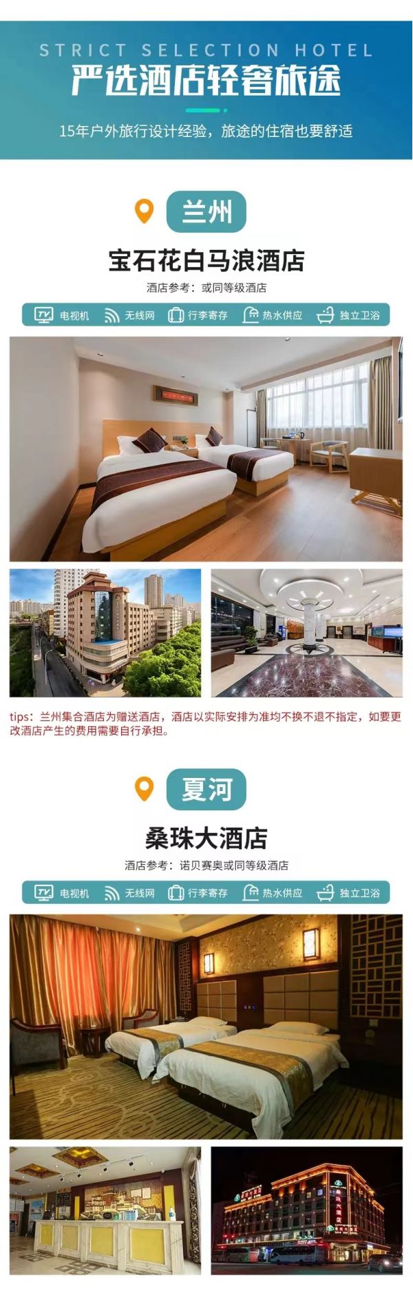tips:蘭州集合酒店為贈(zèng)送酒店,酒店以實(shí)際安排為準(zhǔn)均不換不退不指定,如要更改酒店產(chǎn)生的費(fèi)用需要自行承擔(dān)。