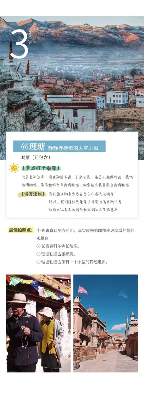 ? 然后理塘最著名的景點(diǎn),同時(shí)也是318國(guó)道上最大的格魯派寺院【長(zhǎng)青春科爾寺】,寺廟聲名遠(yuǎn)播,享有“上有拉薩三大寺,中有理塘長(zhǎng)青春科爾寺,下有安多塔爾寺”之美譽(yù),寺內(nèi)珍藏有各種類型的釋迦牟尼鍍金銅像,佛教經(jīng)典、三世達(dá)賴用過(guò)的馬鞍、明清時(shí)代的壁畫等珍貴文物。長(zhǎng)青春科爾寺旁邊還有今年爆火的【勒通古鎮(zhèn)】,這是全國(guó)唯一一個(gè)依托倉(cāng)央嘉措并打造倉(cāng)央嘉措一生之路的特色文化景點(diǎn),我們?cè)谶@里可以游覽倉(cāng)央嘉措博物館,倉(cāng)央嘉措也留有名篇“潔白的仙鶴,請(qǐng)把翅膀借給我,不去遙遠(yuǎn)的地方,到理塘轉(zhuǎn)一轉(zhuǎn)就飛回”來(lái)描述這個(gè)地方。