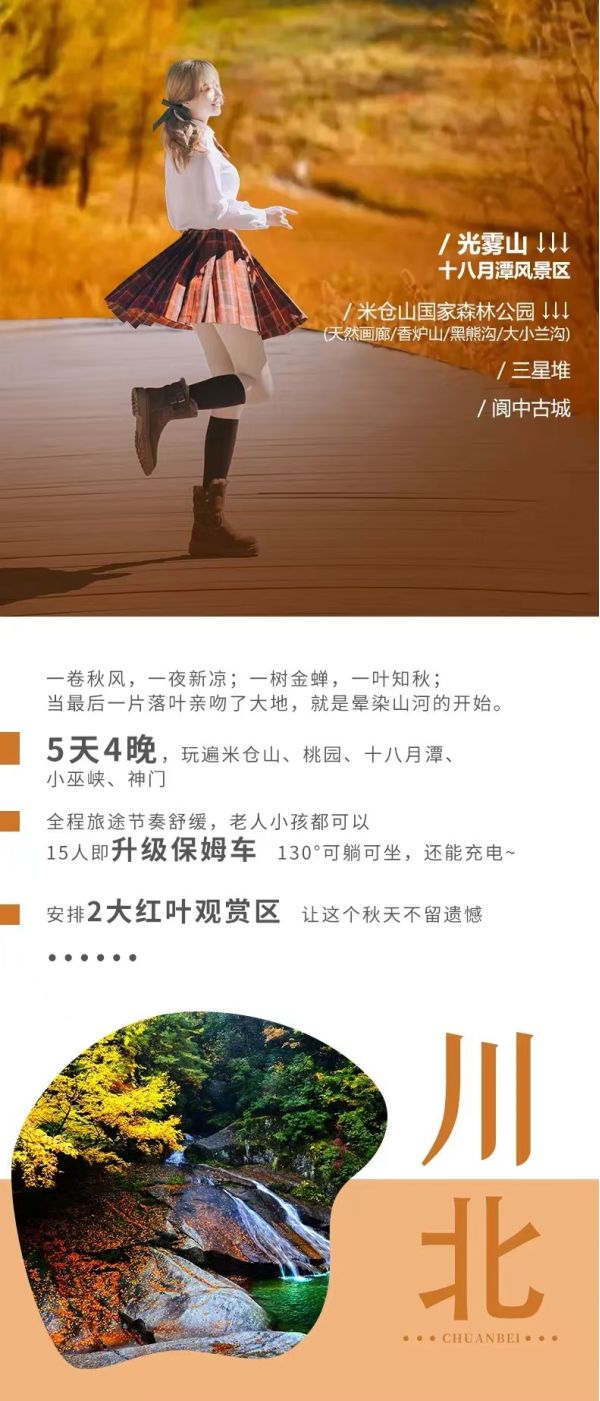 早餐后出發(fā),經(jīng)成巴高速抵達(dá)位于川東北的巴中【光霧山】,光霧山被譽(yù)為“中國紅葉第一山”,因常年云霧繚繞而得名,每年10月~11月是觀賞光霧山紅葉的最佳時(shí)機(jī)?!臼嗽绿丁渴遣卦诠忪F山深處的動(dòng)人篇章,曾有人說:十八月潭是川東北的“九寨溝”,瀑布似九寨,紅葉絕天下。在長(zhǎng)約3.5公里的珍珠溝內(nèi),密布著18個(gè)恍若神造仙成的瀑潭,每個(gè)潭形似月桂,基本上有一相映的瀑布,謂之“十八月潭”。大小水潭似顆顆珍珠綴成的長(zhǎng)長(zhǎng)珠鏈,沿溝飛瀉的瀑流如粒粒珍珠鋪就的幅幅珠簾。漫步其間,潭水相連,時(shí)而穿過大片彩林,一瀉千里,時(shí)而一片靜謐,明凈幽藍(lán)。登高俯瞰,滿目流金瀉玉、彩虹波動(dòng),尤如串串珍珠藏于溝壑溪澗。步入十八月潭,如在畫中游,讓你陶醉得駐足不前。看過秋景后前往光霧山鎮(zhèn)入住。