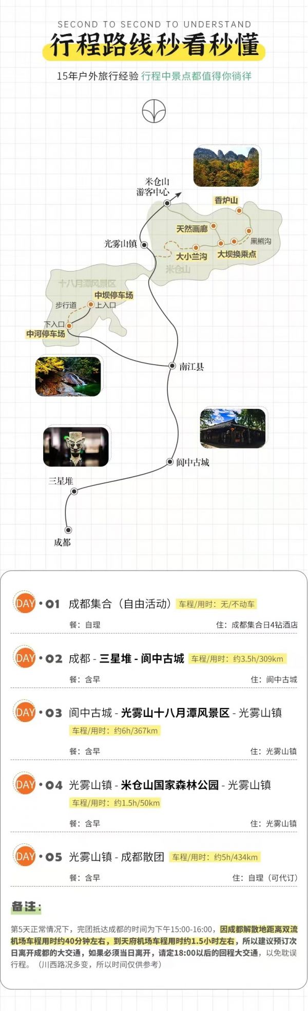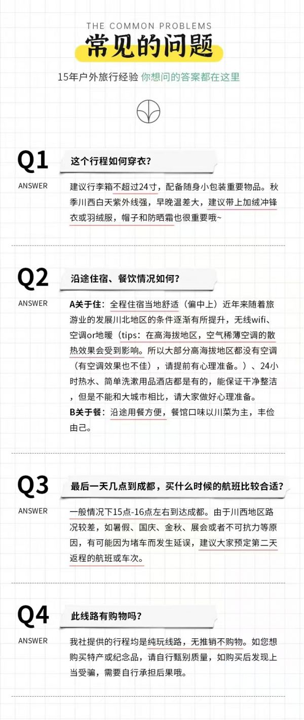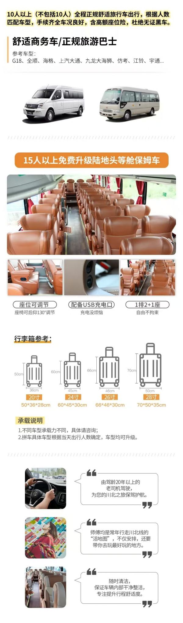 (2)正常情況下,抵達(dá)成都的時(shí)間為下午15:00-16:00,如果必須當(dāng)日離開,請(qǐng)定18:00以后的回程大交通,以免耽誤行程,敬請(qǐng)諒解;