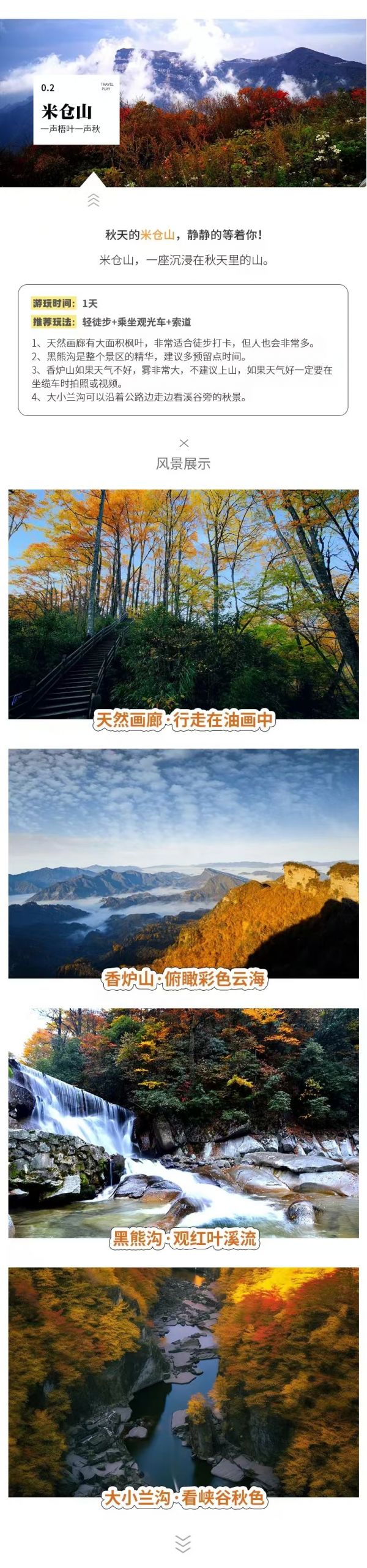 接著前往【香爐山】,香爐山海拔2300米,是川陜兩省的界山之一。如果天氣好,在五彩的紅葉山峰之間可以看到縹緲著的絕美云海,目之所及,重巒疊嶂、萬葉飄丹、層林盡染。