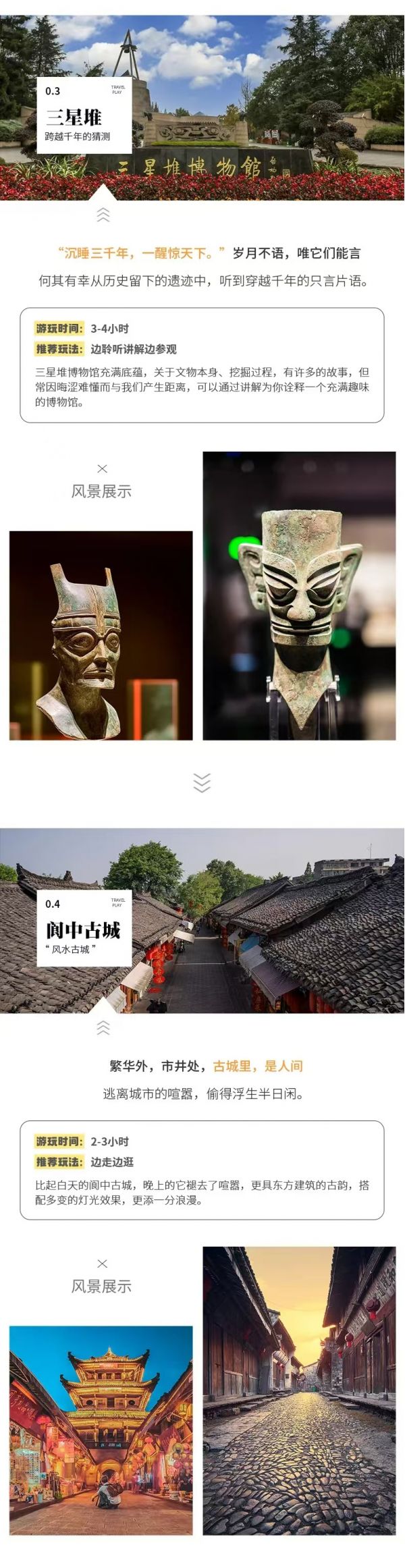 早晨從成都酒店出發(fā),大家相互認(rèn)識(shí),相互熟悉,一路歡歌笑語,充滿期待。隨后抵達(dá)【三星堆博物館】開始參觀,三星堆古遺址距今已有3000至5000年歷史,是迄今在西南地區(qū)發(fā)現(xiàn)的范圍最大、延續(xù)時(shí)間最長(zhǎng)、文化內(nèi)涵最豐富的古城、古國、古蜀文化遺址。在這批古蜀秘寶中,有許多光怪陸離奇異詭譎的青銅造型,有高2.62米的【青銅大立人】、有寬1.38米的【青銅面具】、更有高達(dá)3.95米的【青銅神樹】等,均堪稱獨(dú)一無二的曠世神品。而以流光溢彩的金杖為代表的金器,以滿飾圖案的邊璋為代表的玉石器,亦多屬前所未見的稀世之珍。游覽后繼續(xù)出發(fā),下午抵達(dá)【閬中古城】,古城山圍四面,水繞三方,有著2300多年的歷史,與安徽黃山的徽州古城、山西平遙的平遙古城和云南麗江的麗江古城并稱為中國四大古城,如果說麗江古城是風(fēng)花雪月,那么閬中古城便是人間煙火,古城里時(shí)不時(shí)飄出的陣陣醋香更是久久縈繞在心頭,古城所蘊(yùn)含的三國文化、春節(jié)文化、科舉文化更是值得深入探究。晚上我們?nèi)胱」懦侵苓叄绕鸢滋斓拈佒泄懦?,晚上的它褪去了喧囂,更具東方建筑的古韻,搭配多變的燈光效果,更添一分浪漫。
