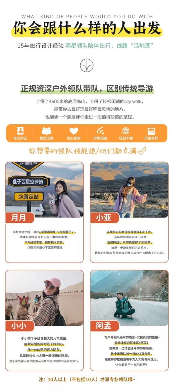 每周三、六發(fā)團(tuán),團(tuán)期如下所示: 第1期:2025年10月12日成都集合——10月16日成都散團(tuán) 第2期:2025年10月16日成都集合——10月20日成都散團(tuán) 第3期:2025年10月19日成都集合——10月23日成都散團(tuán) 第4期:2025年10月23日成都集合——10月27日成都散團(tuán) 第5期:2025年10月26日成都集合——10月30日成都散團(tuán)
