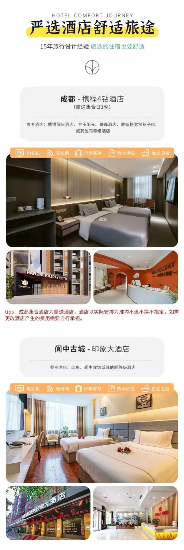 住宿:含全程4晚舒適酒店。(tips:成都集合酒店為贈(zèng)送酒店,酒店以實(shí)際安排為準(zhǔn)均不換不退不指定,如要更改酒店產(chǎn)生的費(fèi)用需要自行承擔(dān)。)