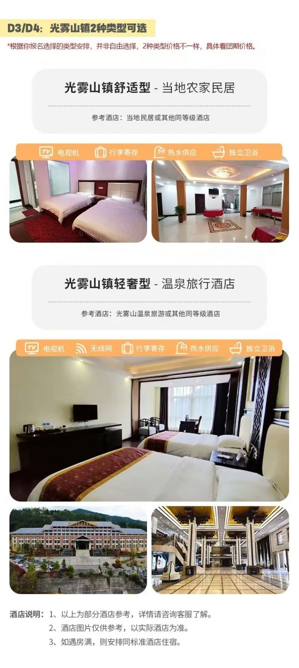 光霧山鎮(zhèn)因深處川東北山區(qū),住宿條件有限,請(qǐng)大家對(duì)酒店合理期待,但我們提供了輕奢/舒適2檔類型酒店可供選擇。