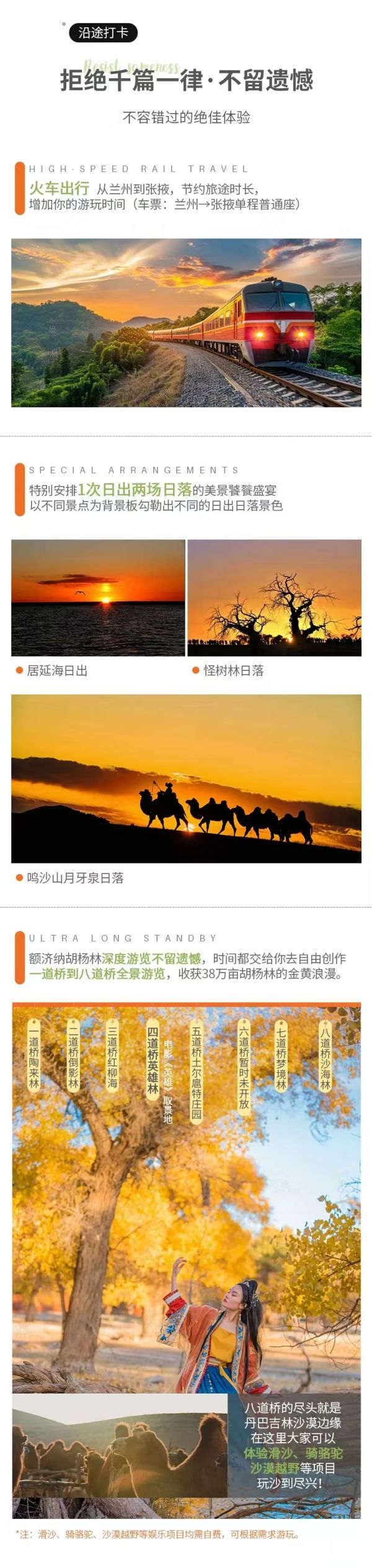 巴丹吉林沙漠自費項目(沙漠越野、踏板滑沙、駱駝騎行等),鳴沙山月牙泉景區(qū)自費項目(騎駱駝、滑沙、沙漠越野車、沙漠摩托車、滑翔飛機、直升飛機等)