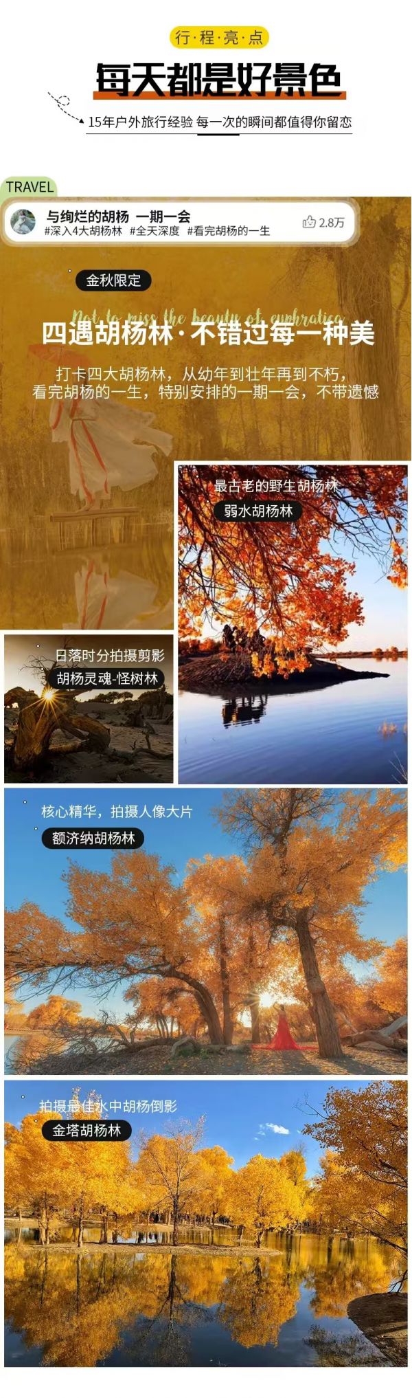 在【額濟納胡楊林景區(qū)】自由游玩攝影創(chuàng)作,從一道橋到八道橋,去收獲這38萬畝胡楊林的一片金黃浪漫。