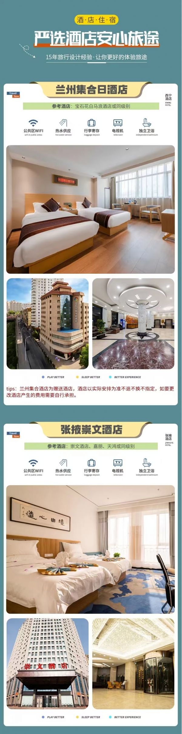tips:蘭州集合酒店為贈送酒店,酒店以實際安排為準(zhǔn)均不退不換不指定,如要更改酒店產(chǎn)生的費用需要自行承擔(dān)。