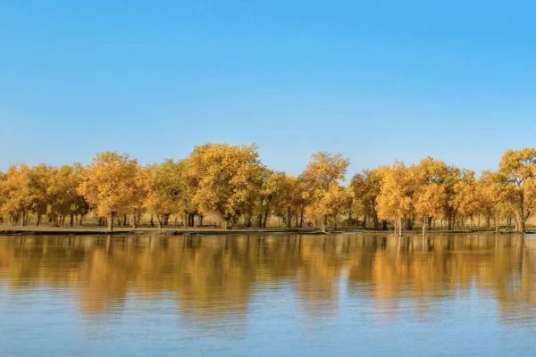3、選擇好襯托物:以天空的藍(lán)色,加上白云的點綴,襯托出胡楊林的金黃色,或以湖水為背景,貼近湖面,拍攝出大小不一的金黃倒影;