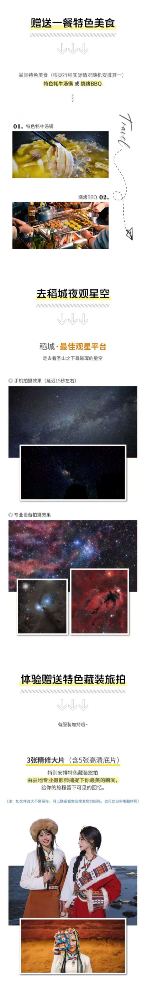 特色亮點(diǎn):前往稻城最佳觀星平臺(tái)(去稻城夜觀星空);因冬季天氣寒冷由11.14日-明年4月取消稻城夜拍星空