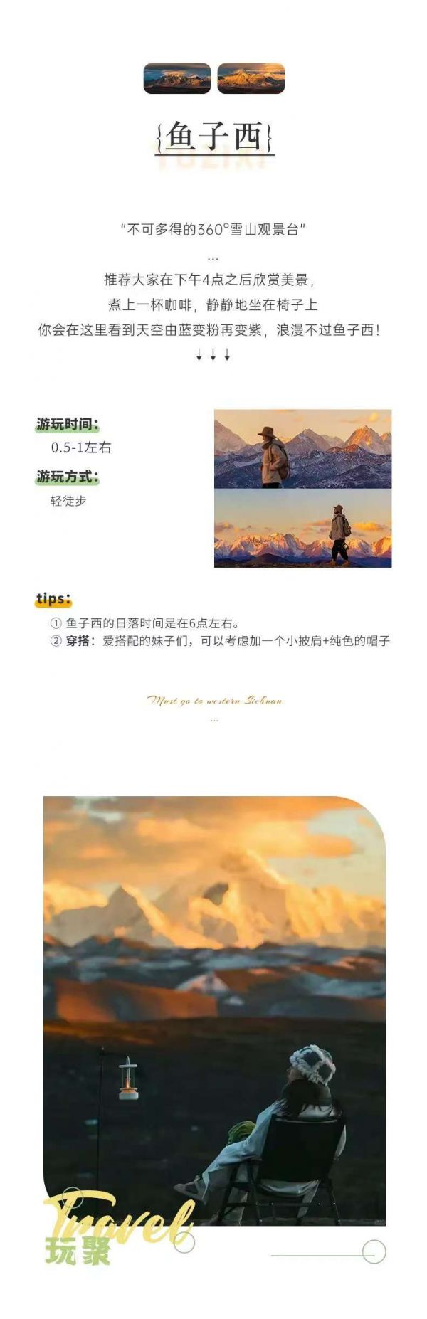3、在魚子西看日落時(shí),氣溫會(huì)比較低,要帶上足夠的保暖衣物。同時(shí),由于海拔較高,要注意預(yù)防高反,避免劇烈運(yùn)動(dòng)。