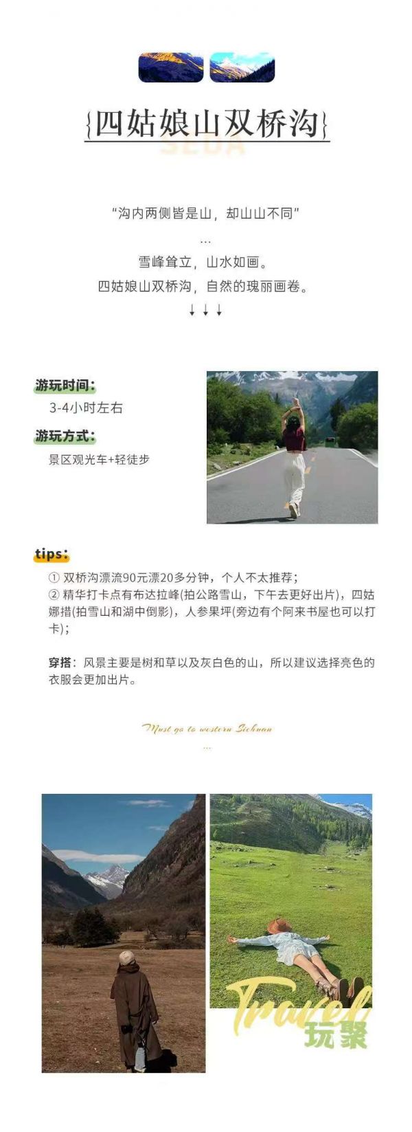 溫馨提示:四姑娘山海拔較高,可能會(huì)有輕微的高反癥狀,如頭暈、氣短等,可提前準(zhǔn)備一些抗高反藥物。山區(qū)氣候多變,記得帶上保暖衣物和雨具。