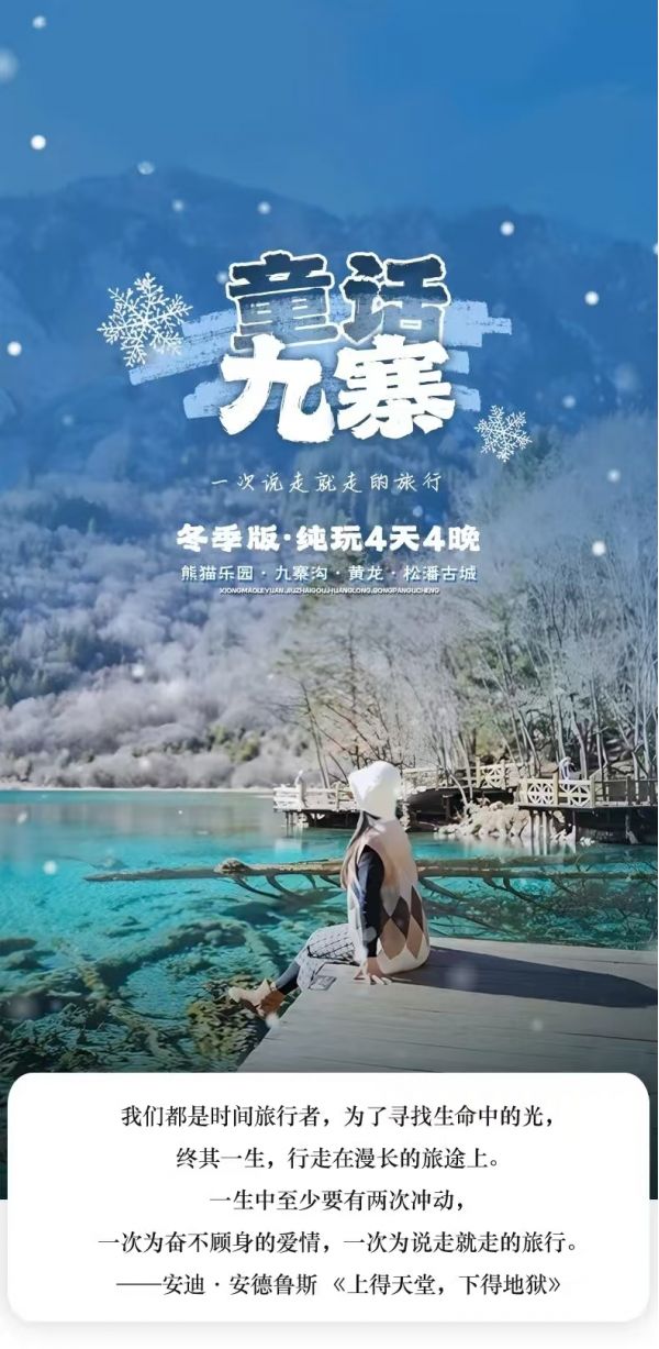 隨著季節(jié)的變化,九寨溝也呈現(xiàn)出不一樣的風(fēng)姿;深秋的九寨溝享譽(yù)世界,只見漸次經(jīng)霜的彩林深淺相間、錯落有致,是“萬山紅遍,層林盡染”的最佳寫照,在漫山遍野濃烈的紅襯托之下,碧水更綠、藍(lán)天更藍(lán),呈現(xiàn)出光怪陸離的水景;待入冬,莽莽林海都覆上皚皚白雪,林海雪原似玉樹瓊花,潔白、高雅,是觀賞九寨六絕之“藍(lán)冰”和“雪峰”的最好時機(jī)。也因這不二的美,這里也是許多熱門影視劇里的取景場地,今天我們就在這個大小熒屏收錄過的仙境來一場旅拍,由專業(yè)駐地攝影師為大家拍攝漢服/藏裝旅拍大片,每人2張精修電子照、底片全送,定格住旅程最美的瞬間。