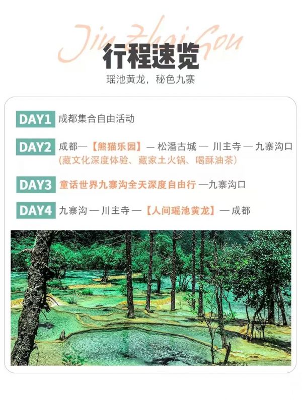 門票:含熊貓樂園門票、黃龍門票、九寨溝門票(優(yōu)惠及退票請現(xiàn)詢報名處。)