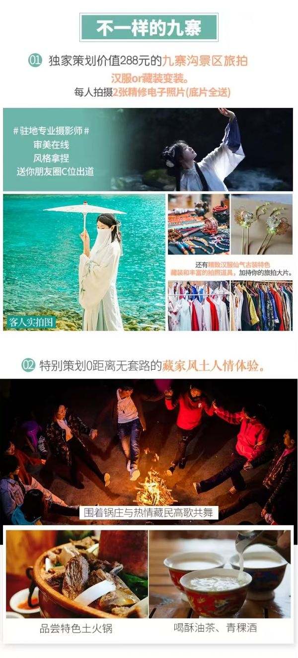 (1)獨(dú)家策劃九寨溝景區(qū)圣地旅拍,穿上漢服/藏裝,在圣地定格下最美的瞬間。