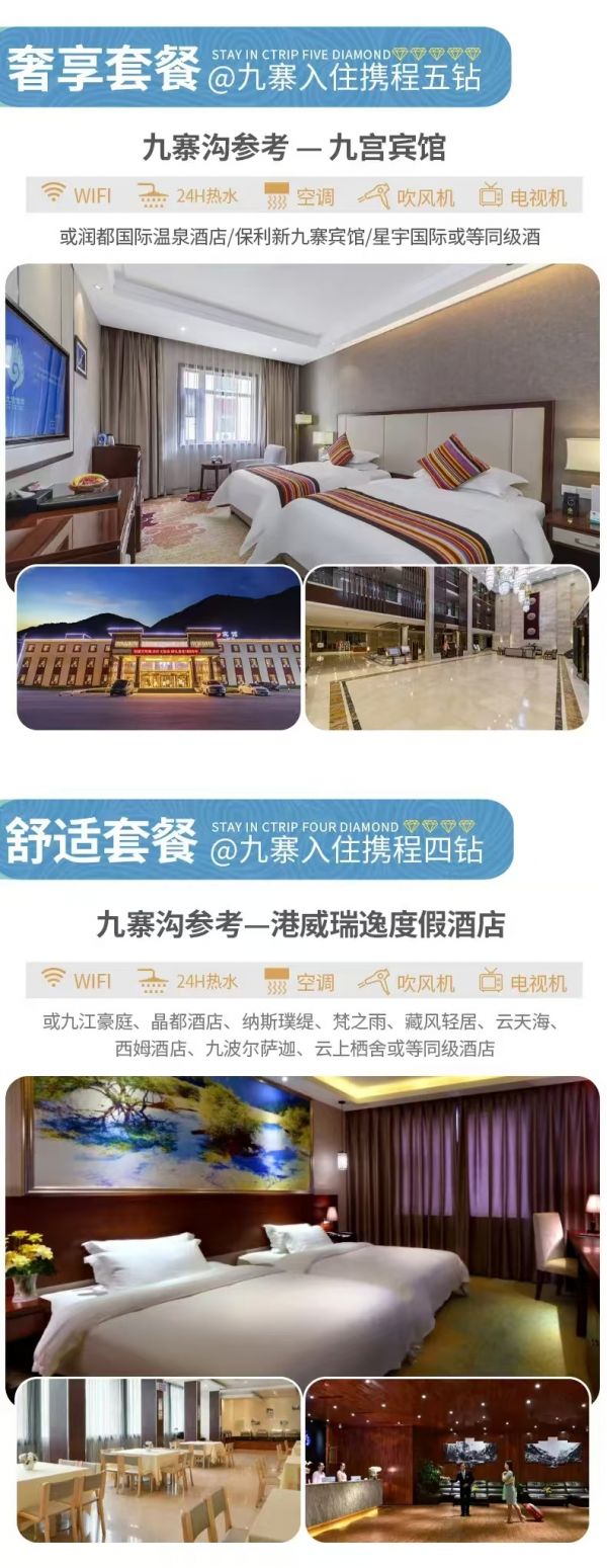 九寨溝:九江豪庭/港威瑞逸/晶都酒店/納斯璞緹/梵之雨/藏風(fēng)輕居/云天海/西姆酒店/九波爾薩迦/云上棲舍或等同級酒店