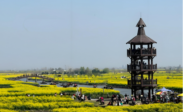 早上我們前往“中國最美的油菜花海”──【千島菜花風(fēng)景區(qū)】,千島菜花景區(qū)被稱作“中國最美的水上油菜花”三月至四月便是此最美的季節(jié),座落在河網(wǎng)縱橫的缸顧?quán)l(xiāng),一條條的小河又分支出一條條的小溝,南北東西延伸開去,把一整塊的田分列割成了千百個(gè)“小島”,這種“小島”興化人把它稱作“垛”。垛子只比水面高出一點(diǎn)點(diǎn),整齊劃一地排著,就像是列隊(duì)檢閱的方陣,氣勢(shì)恢宏,波瀾壯闊,登上20多米高的觀光瞭望臺(tái),極目遠(yuǎn)眺,滿眼盡是金黃色的菜花,形成一道獨(dú)特的自然風(fēng)景,身臨其境,心曠神怡;