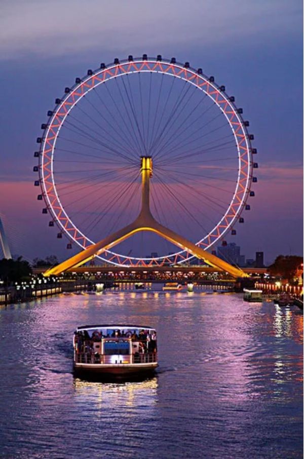 天津之眼”摩天輪,全稱天津永樂(lè)橋摩天輪,位于天津市河北區(qū)李公祠大街與五馬路交口,跨海河連接河北區(qū)與紅橋區(qū)。它是一座跨河建設(shè)、橋輪合一的摩天輪,也是世界上唯一一座建在橋上的摩天輪,兼具觀光和交通功用,是天津的地標(biāo)建筑之一。該摩天輪于2006年開(kāi)始建設(shè),2009年4月16日正式開(kāi)放,2010年12月10日被評(píng)定為