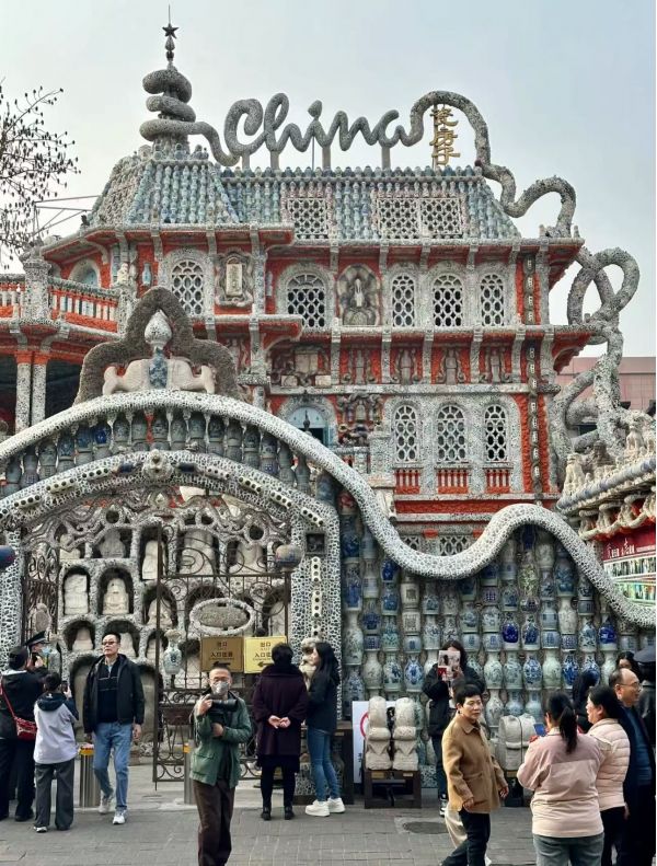 由635個民國和晚清時期的古瓷瓶壘砌串聯(lián)而成,“平”取諧音“瓶”而來,寓意平平安安,院墻呈波浪形曲線,契合瓷房子中西合璧的設計思想。