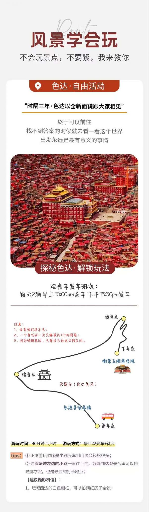 1、觀覽人員請務(wù)必注意各自所購買票務(wù)乘車點位。因色達當(dāng)?shù)厍闆r特殊景點必須乘坐景區(qū)交通,還望游客諒解!