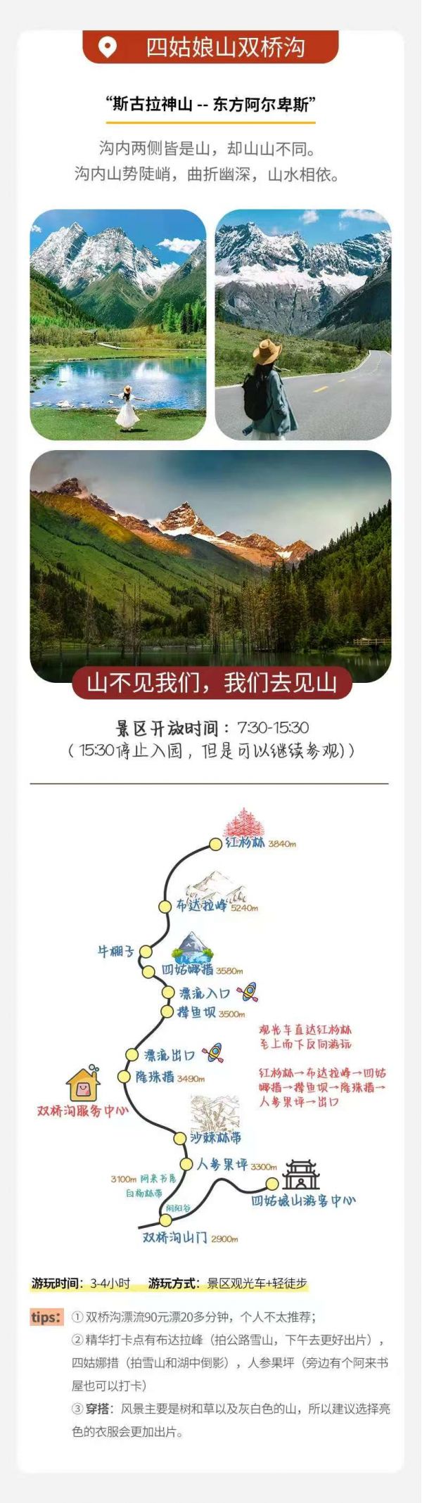 因雙橋溝有限流要求,如遇票滿,我們將更換安排海子溝和長坪溝的門票,以上兩個景點也同屬四姑娘山。
