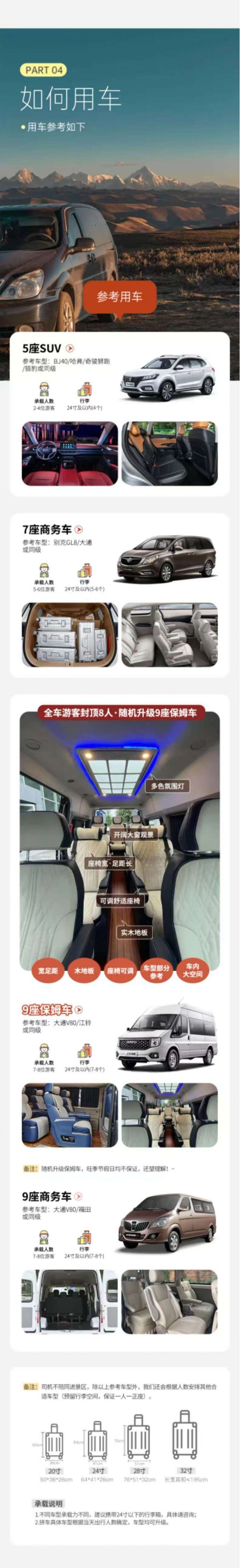 為保證成團及質(zhì)量,根據(jù)人數(shù)派不同座位數(shù)用車,保證每人一正座;
