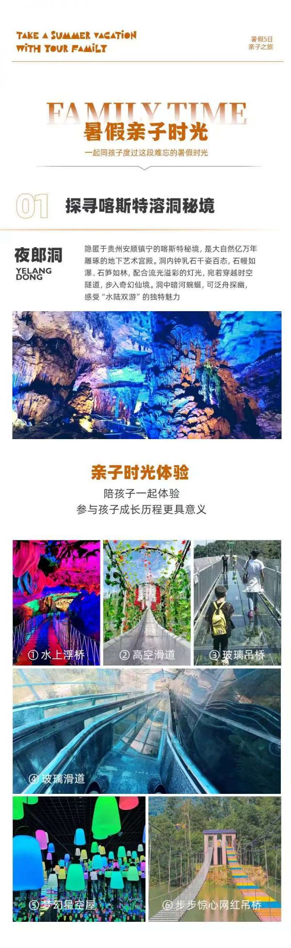 上午:酒店早餐后乘車前往探洞【夜郎洞】(成人兒童均已包含景區(qū)內(nèi)套票:水上浮橋—高空滑道—玻璃吊橋—玻璃滑道—夢(mèng)幻星空屋—步步驚心網(wǎng)紅橋),隱匿于貴州安順鎮(zhèn)寧的喀斯特秘境,是大自然億萬(wàn)年雕琢的地下藝術(shù)宮殿。洞內(nèi)鐘乳石千姿百態(tài),石幔如瀑、石筍如林,配合流光溢彩的燈光,宛若穿越時(shí)空隧道,步入奇幻仙境。洞中暗河蜿蜒,可泛舟探幽,感受“水陸雙游”的獨(dú)特魅力。還有各項(xiàng)體驗(yàn)項(xiàng)目: