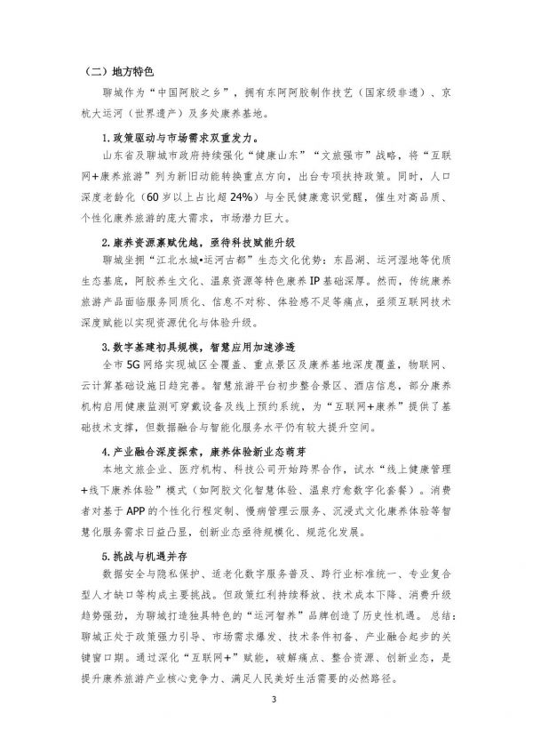 黨的二十大以來“健康中國”戰(zhàn)略全面實(shí)施。2024年山東省65歲以上老齡人口占比達(dá)17.73%(高于全國15.6%),國家相繼印發(fā)《“十四五”健康老齡化規(guī)劃》《“十四五”國民健康規(guī)劃》。山東省印發(fā)了《山東省醫(yī)養(yǎng)健康產(chǎn)業(yè)發(fā)展規(guī)劃(2023-2027)》,聊城市也隨之發(fā)布了《聊城市大健康產(chǎn)業(yè)發(fā)展規(guī)劃(2024—2028年)》等政策文件,關(guān)于健康的政策紅利持續(xù)釋放。隨著“健康中國2030”戰(zhàn)略推進(jìn)和老齡化加劇,康養(yǎng)旅游作為新興融合業(yè)態(tài),已成為區(qū)域經(jīng)濟(jì)轉(zhuǎn)型的重要?jiǎng)恿?,國家《“十四五”旅游業(yè)發(fā)展規(guī)劃》明確指出支持特色康養(yǎng)旅游發(fā)展。